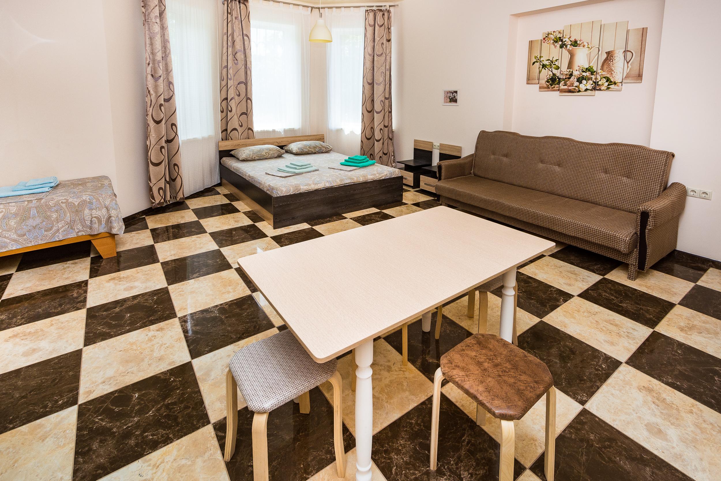 Предлагаем комфортные номера на 2, 3 и 4 человека, а в отдельных вариантах возможно размещение до 5 гостей. Номера есть общей площадью 24 м² или 32 кв.м., оборудованы двуспальной кроватью размера "Queen Size" с ортопедическим матрасом, одной или двумя односпальными кроватями и раскладным диваном (книжка). В числе удобств: кондиционер, ЖК-телевизор, холодильник, сейф, фен, интернет Wi-Fi. Хорошая звукоизоляция, высокие потолки, москитные сетки, своя ванная комната, круглосуточно холодная и горячая вода. Цена указана за двухместный номер. Стоимость каждого дополнительного места 700 рублей.